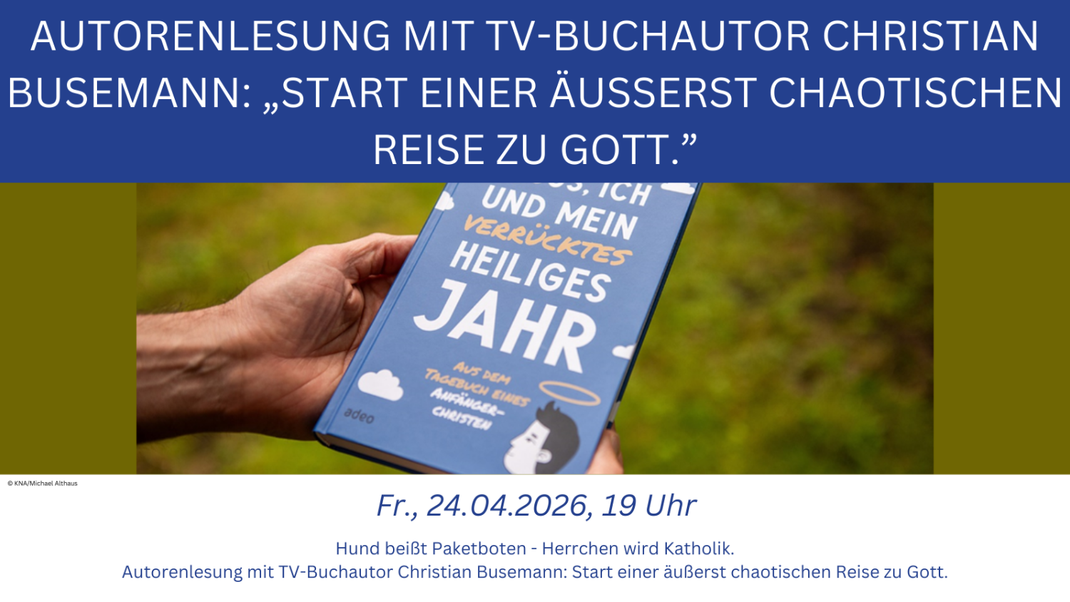 Er suhlt sich im Kot, beißt den Paketboten und rupft ein Huhn des Nachbarn. Hund Kalle bringt Christian Busemann an den Rand des Wahnsinns. Und nicht nur das: Weil er den Vierbeiner gegen den ausdrücklichen Willen seiner Frau angeschafft hat, sorgt das Tier für einen Ehestreit. Es folgen Paarberatung, Selbstreflexion und die Einsicht, sich selbst weiterentwickeln zu müssen. Busemanns Weg zum katholischen Glauben startet.